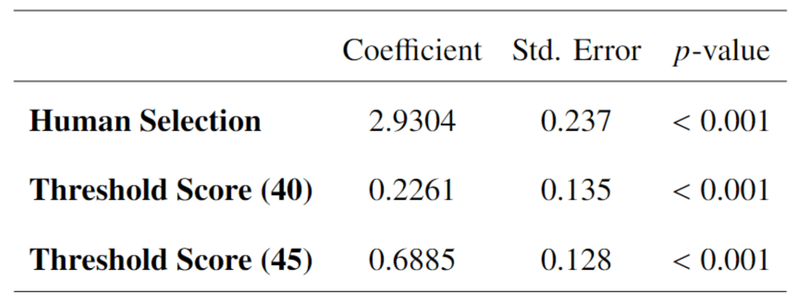 Here, the results of a logistical regression clearly show that the model performs worse than its human counterparts. The two lower rows are the results of Harvester, which show that the model gets better when we introduce a threshold (comment: we were able to focus our model better because we know what we are looking for and optimised for the highest Cherry-fit) for the scoring but is still far off the human judgement.