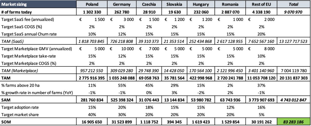 We illustrate the above dynamics in this document. It’s a simple market sizing calculation of a (fully fictional) SaaS-enabled marketplace in agro space. They target mid-to-large-size farms to manage their day-to-day operations (vertical SaaS) and sell crops directly to buyers (B2B marketplace). The document is just an example, showcasing a simple, back-of-the-envelope market sizing and fund economics calculation.