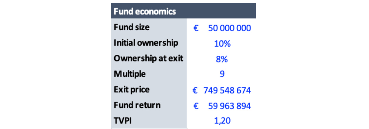 Investors frequently mention looking for companies with "venture scalability" but rarely explain their rationale to founders. Due to the power law distribution of startup outcomes (many investments failing, a few performing below expectations and only a couple reaching their initially projected size), most VCs aim to be able to return their fund size with every single investment. For instance, a €100M fund expecting to own 10% of the company at exit (starting with 15% but even after some follow-on investments getting diluted in growth-stage rounds) will look at opportunities with €1B exit potential (€1B x 10%=€100M). On the other hand, a €25M fund writing smaller checks and ending up with 5% ownership at exit will set its bar at €500M.