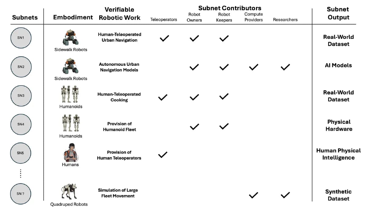 Frodobots Lab have already created the first 2 subnets: Teleoperation of Sidewalk Robots and Development of Autonomous Urban Navigation Models for Sidewalk Robots. But there are a plethora of subnets to explore next: