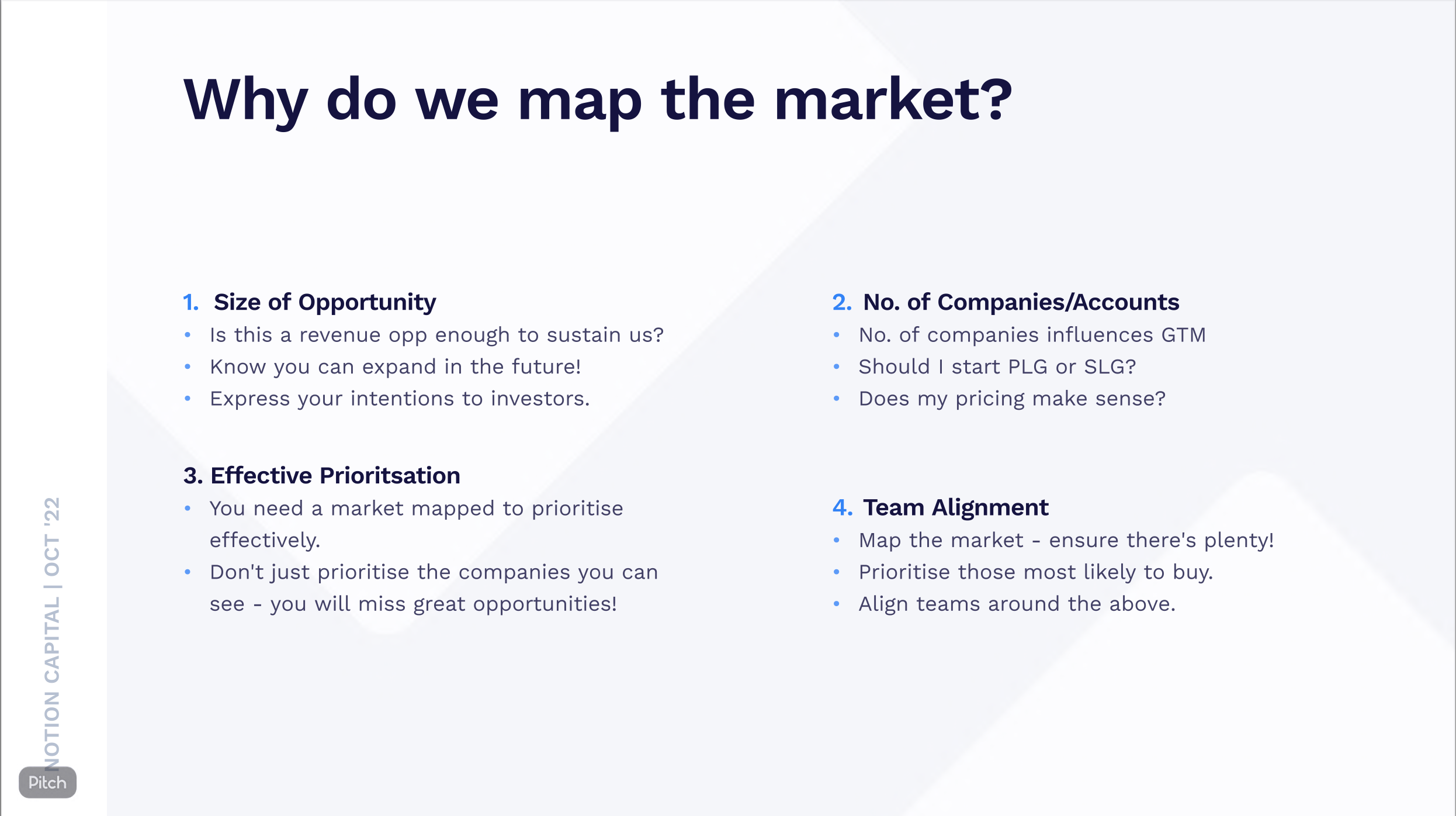 We map the market to understand the size of the business opportunity you have ahead of you, i.e. how much revenue potential is there in the SAM you operate in today. This is critical and something never to lose sight of and ask yourselves, if we achieve a significant market share, maybe 10%, or in applying some historic funnel performance, where do you end up in terms of revenue? Is this high enough to sustain the company over the next X years? Or until your next milestone?