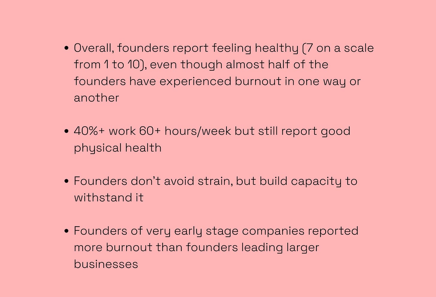What we particularly appreciate about the report is its concreteness. It offers clear, honest insights into how founders sustain themselves and their teams over the many years it takes to build a company from the ground up. It also confronts what can happen when endurance is pushed too far or neglected altogether â a downside of company building that we often deny or postpone acknowledging, until reality hits hard.